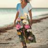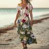 Fashion Women's Summer V-neck Short Sleeve Cotton And Linen Vintage Floral Print Beach Dress