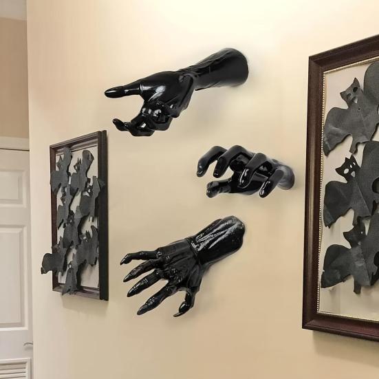 Enhance your Halloween decor with these eerie wall decor hands. The unique shapes and realistic details create a spooky and mysterious atmosphere, perfect for Halloween parties or home decoration. Easily attach them to walls, doors, or furniture using screws or double-sided tape to add a thrilling touch. You can also use them to display jewelry, candles, keys, and more.