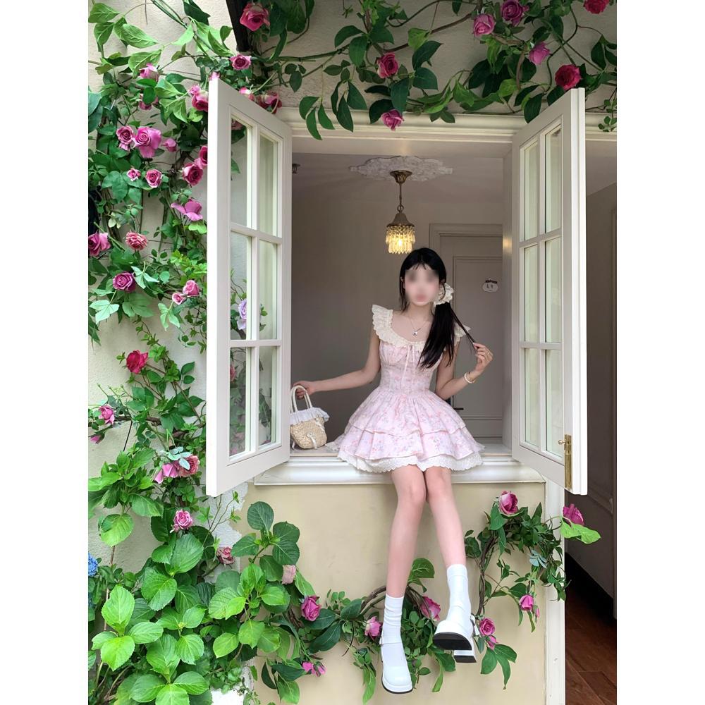New Elegant Floral Dress Women's Small Flying Sleeves Lace Cake Princess Fluffy Short Skirt Summer Sweet and Cute