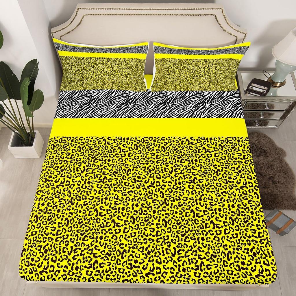 Leopard Kids Fitted Sheet, Black White Striped Bed Cover with Pillowcases, Animal Print Bedding Set for Boys Girls Room Decor