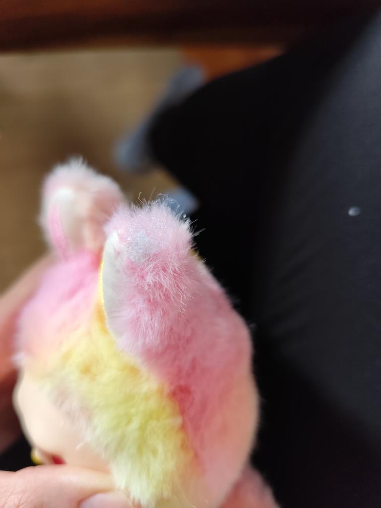 Unfortunately, a Labubu is broken, open at the ear, wadding is sticking out