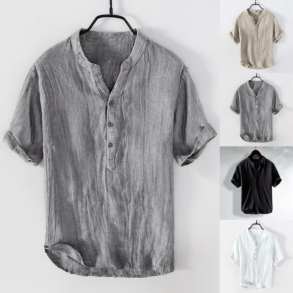 Men's Casual Stand Collar Pullover Shirt Retro Thin Cotton Linen T-shirt Top — buy online with free worldwide shipping!