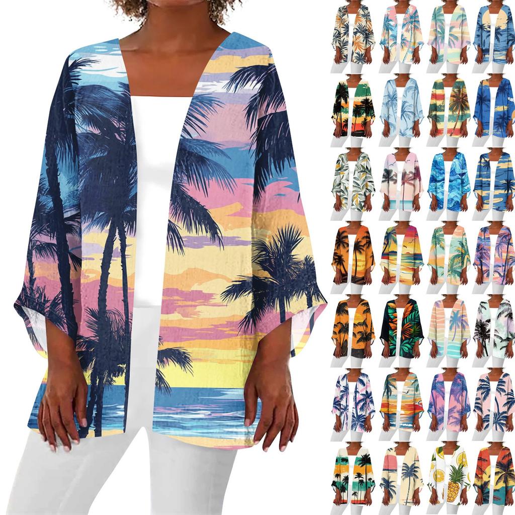 Women's Casual Fashion Beach Ocean Tree Print Lightweight Mid-Length Jacket Cardigan