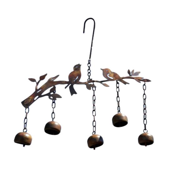 Delight in the beauty of two songbirds perched on exquisite branches adorned with five classic wind chimes. Carefully handmade, this wind chime makes for an exceptional and thoughtful gift choice.