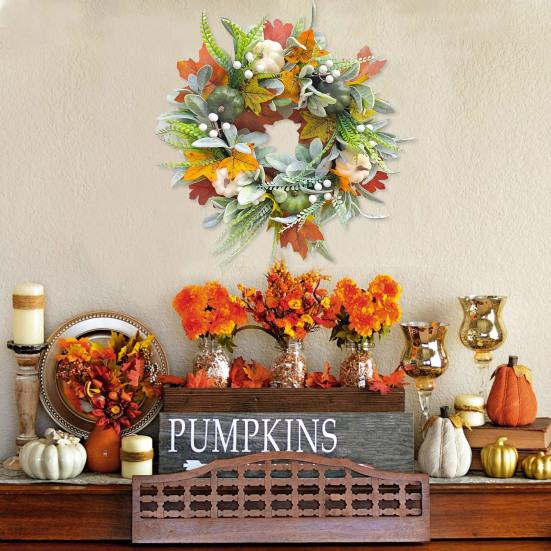 Enhance your home decor with our exquisite simulated wreath. Crafted with meticulous attention to detail, this wreath features a blend of artificial flowers, leaves, berries, and pumpkins, creating a remarkably lifelike appearance.