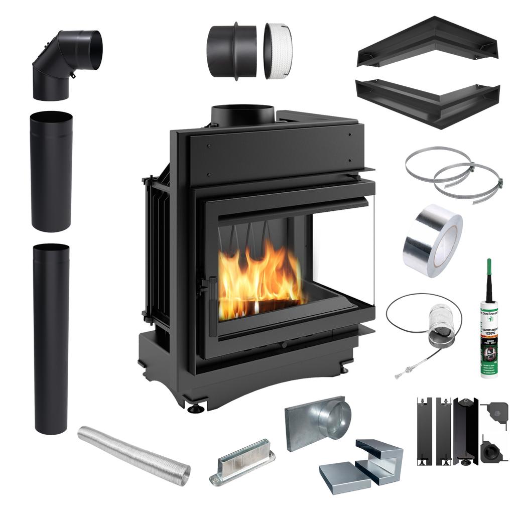 A fireplace insert with two panes compiled with each other at angles (without brackets).