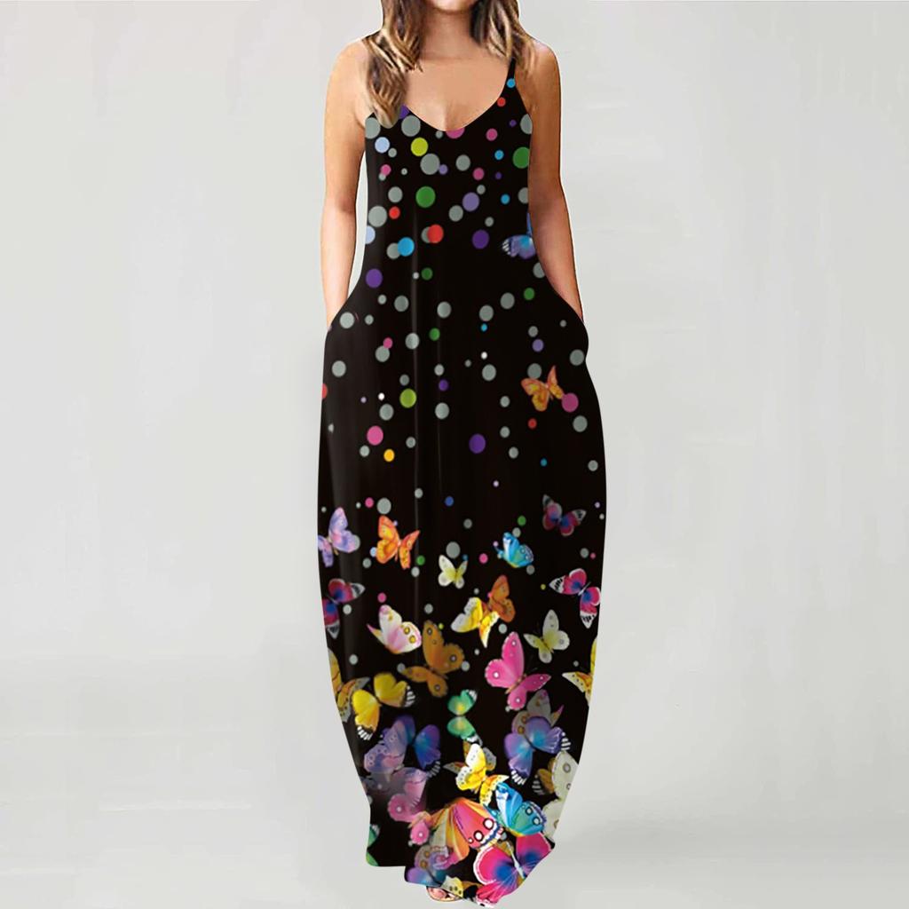 Fashion Women's Loose Casual Summer Print Pocket Sling Sleeveless Dress