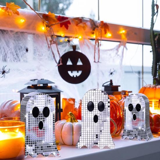 Enhance your Halloween decor with these ghost ornaments. Their vertical structure makes them perfect for various settings like home, parties, bars, and shops. Crafted from reflective acrylic, they create a mesmerizing mirror disco effect that adds a touch of glamour to any space. The ghostly design is both mysterious and fun, making them ideal for Halloween-themed parties and decorations.
