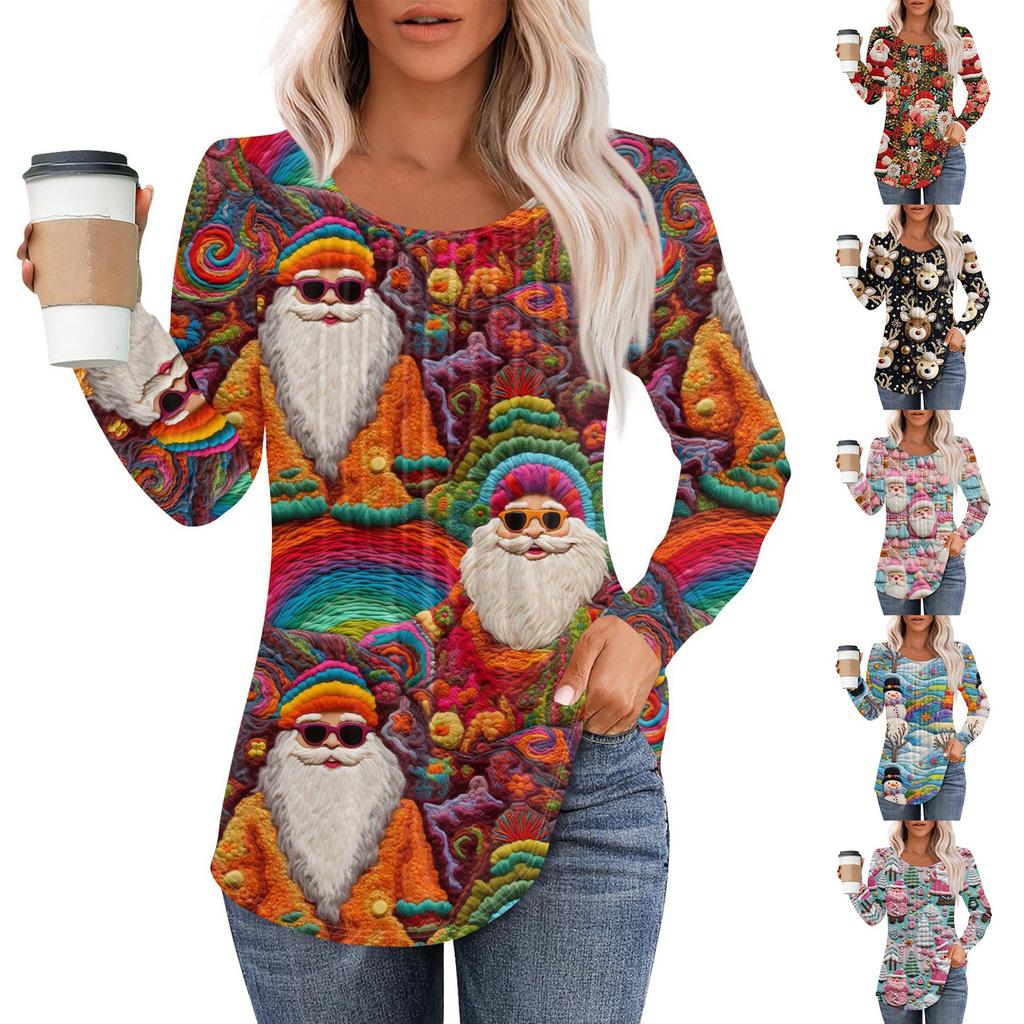 Women's Casual Top Christmas Printed Round Neck Long Sleeved Pleated T-shirt — buy online with free worldwide shipping!
