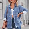 Women's Fashionable Versatile Classic Retro Solid Color Lapel Long Sleeved Pocket Loose Denim Jacket