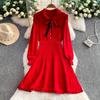 Spring Autumn Women College Stle Polo Color Full Sleeve Bowtie Knitted Sweater Mini Short Pullover Pleated Dresses