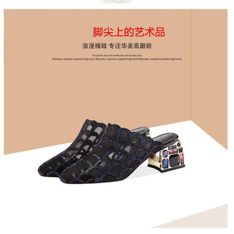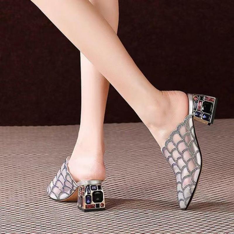 Crystal Half Slippers Female Thick Heels 2025 New Summer Fashion Outside Wear Medium Heel Mesh Cool Female Soft Baotou Sandals — buy online with free worldwide shipping!