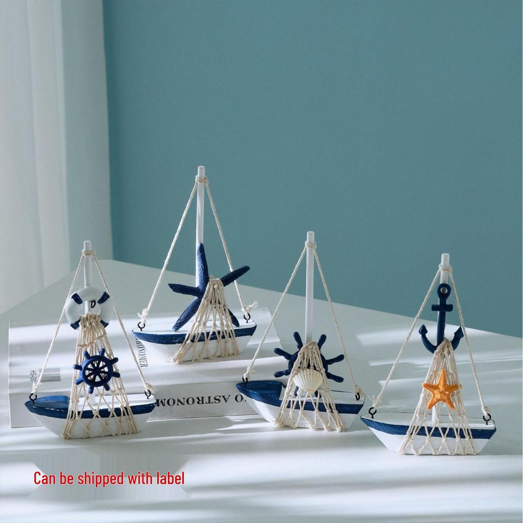 Mediterranean Wooden Sailboat Model with Cotton Rope Net - Mini Desktop Ornament & Photo Prop