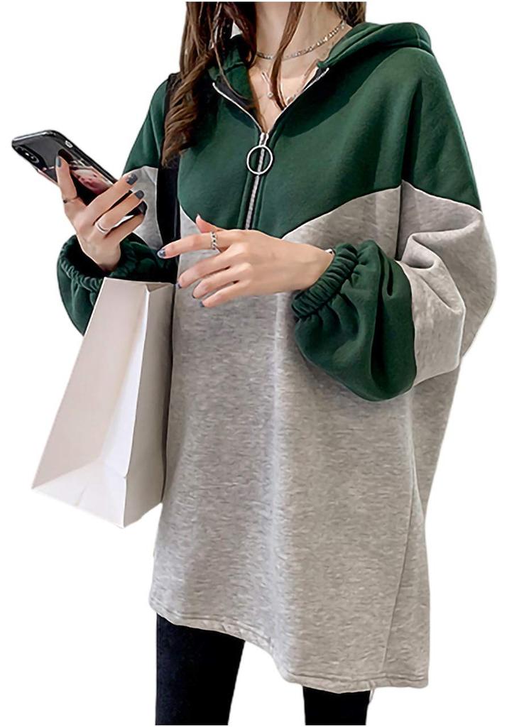 This two-tone hoodie has a long length that covers your bottom completely, and also conceals your figure around your stomach and buttocks.♪ It's a pullover that you can slip on over your head, and it has a zipper at the neck, making it easy to put on and take off! It's simple and easy to use, and sure to be a hit in a variety of situations.♪ It's a loose-fitting long-sleeved top, so it's sure to cover those troublesome upper arms.◎ It has a large, voluminous hood, so it looks stylish and also has the effect of making your face look smaller. It's soft to the touch, so you can wear it for long periods of time without feeling stressed.♪ It's comfortable to wear, so it's great as maternity wear for pregnant women and for coordinating with moms.◎