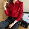 Women's Ash Blue Satin Long Sleeve Shirt - Retro Hong Kong Style, Spring Commute, Concealed Placket, Versatile Drapey Blouse
