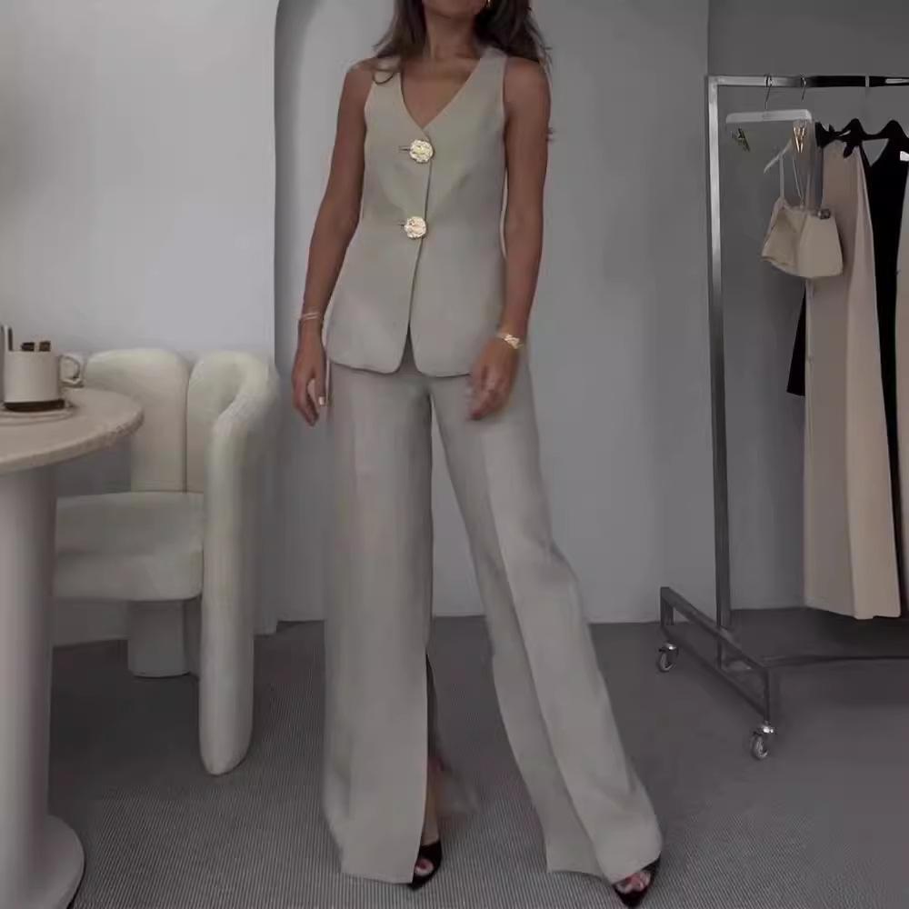 2024 Elegant Solid Color V-neck Sleeveless Vest & High-waisted Wide-leg Pants Set for Women — buy online with free worldwide shipping!