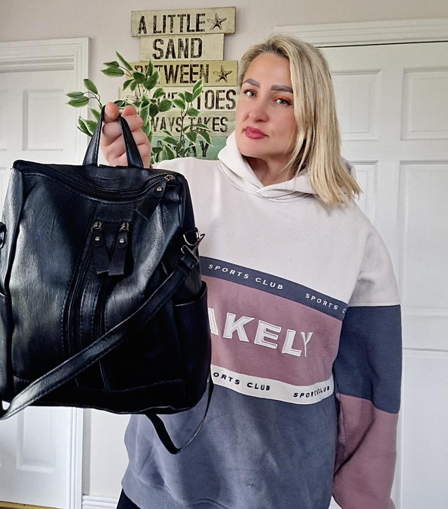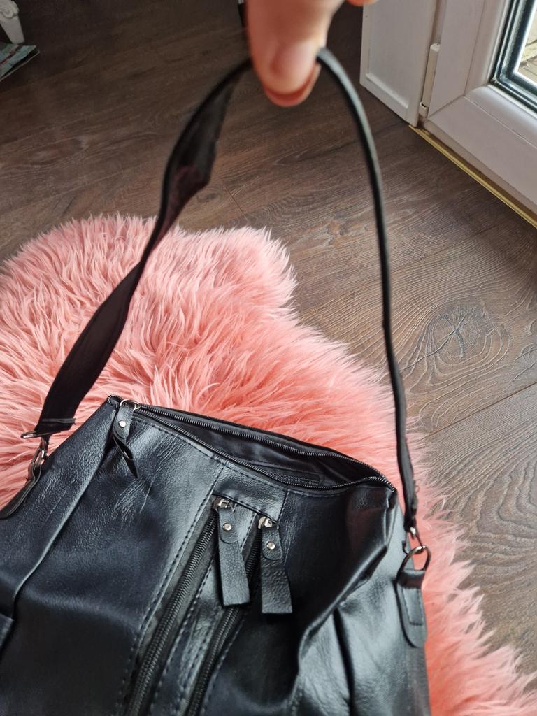 Medium size handbag is perfect for any woman or school girl.Made from leatherette type of material.Don't think you can put heavy things in it as fabric wouldn't be that strong.Has lots of pockets on outside ,lining on inside .Can wear as back pack or as a shoulder bag,the strap came inside of the bag.Delivery took 4 weeks to Ireland.Happy Shopping!