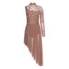 Womens Asymmetrical Lyrical Dance Dress Mock Neck Cutout Sheer Mesh Shiny Rhinestones Performance Costume