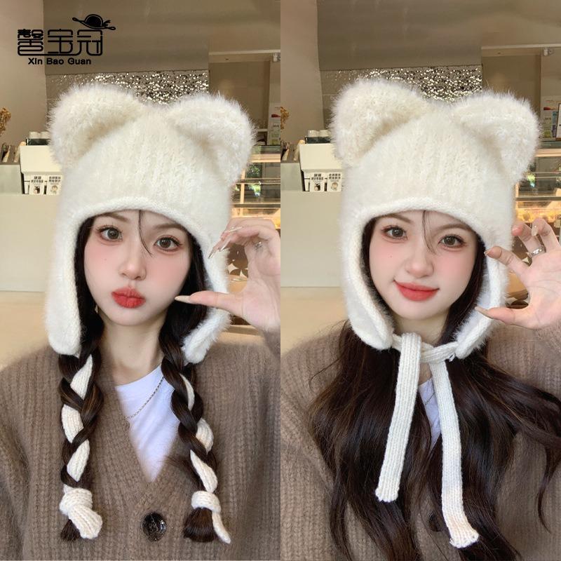 Bear knitted hat children's winter plush warm ear protector wool hat sweet versatile face small pullover hat — buy online with free worldwide shipping!