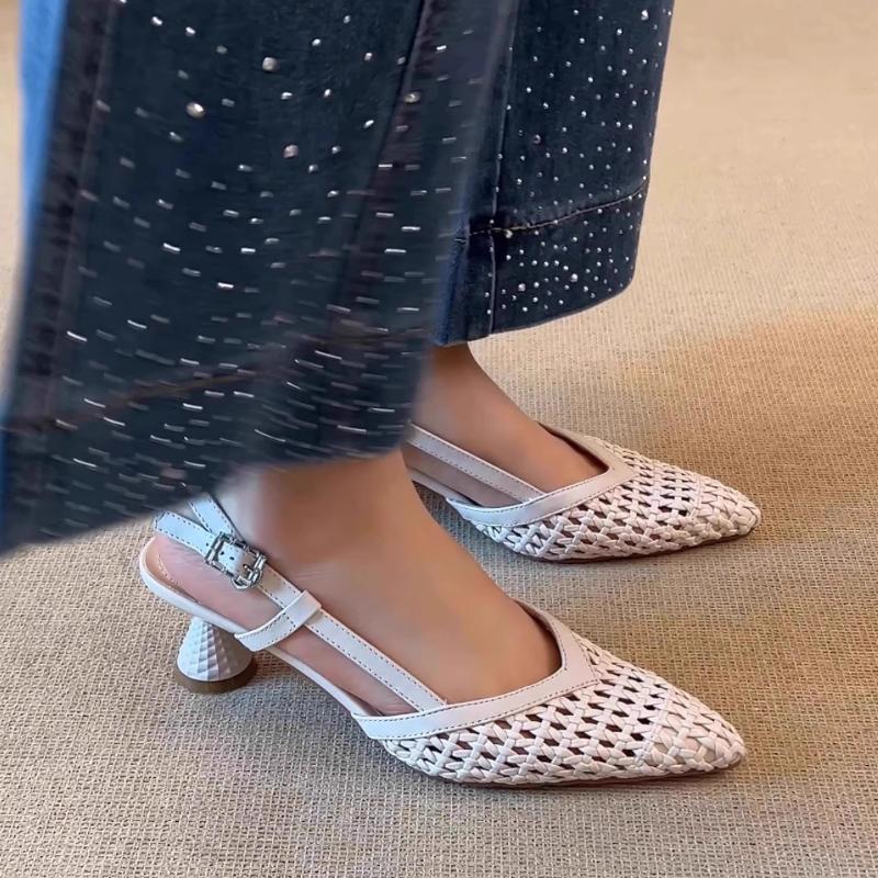 Fashion Women Sandals Temperament Pointed Toe Woven Hollow Shoes Breathable Rear Empty High Heels Sandals Baotou One-word Strap Sandals