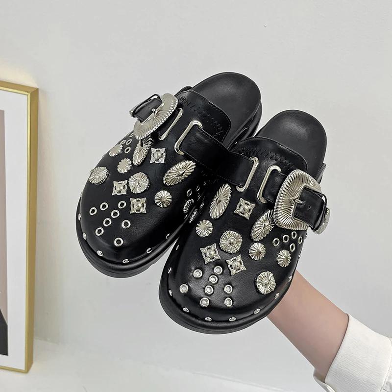 Fashion 2024 New Summer Women Slippers Platform Rivets Punk Rock Leather Mules Creative Metal Fittings Casual Party Shoes Female Outdoor — buy online with free worldwide shipping!