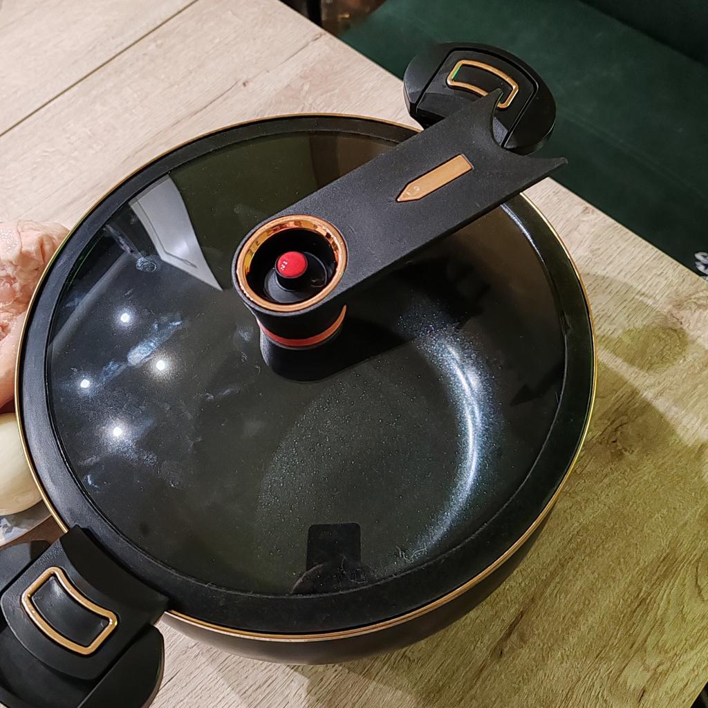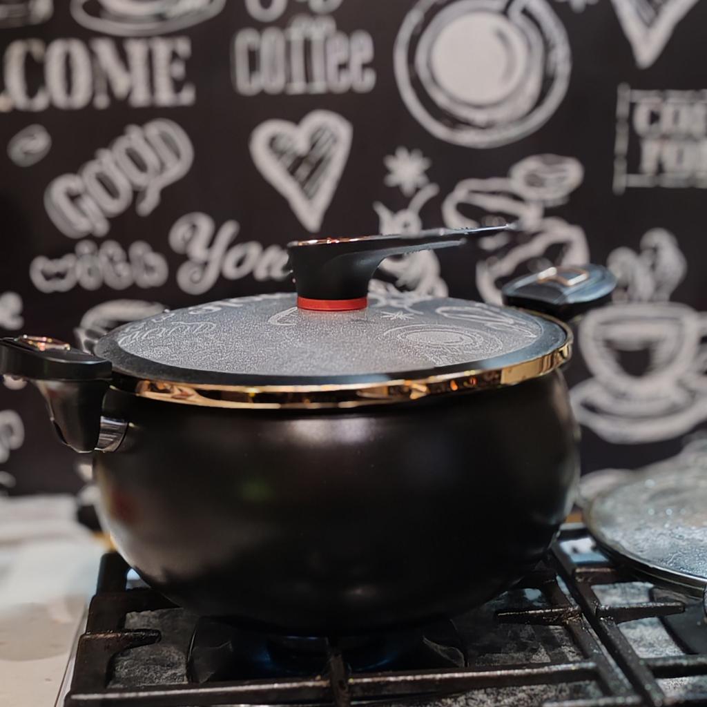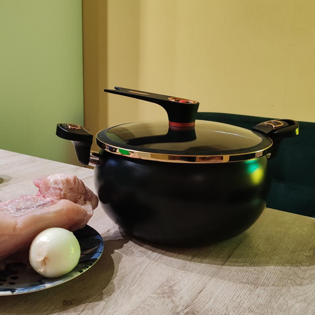 Steamer saucepan with ceramic coating ❤️ Created for a large family, because it holds 8 liters at once. I got used to boiling meat - very convenient. The saucepan has a valve in the lid through which all the steam escapes. The lid itself can be fixed with extendable parts in the handle, so it won't fall off and break.. Arrives in excellent packaging: an outer box, inside a layer of bubble wrap. The pot itself is also in a bag in disassembled form. The handles and lid are in individual bags, there are instructions for screwing them on. Everything is very simple and easy.