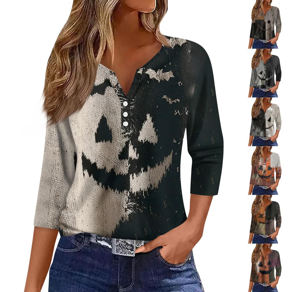 Women's Fashion Button-Up V-Neck Three-Quarter Sleeve Halloween Print Top — buy online with free worldwide shipping!