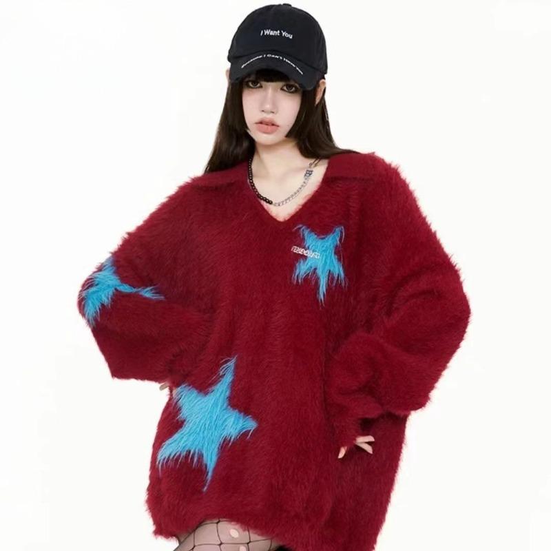 Star Contrasting Women's Sweater V-neck Plush Pullover Sweater Loose Oversized Autumn Winter Outerwear Woman Top
