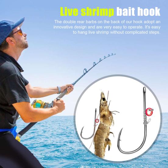 Innovative Double Rear Barbs: Experience convenience with the unique design of double rear barbs on our hooks. Effortlessly hang live shrimp without intricate steps, enhancing your fishing experience with simplicity and efficiency.