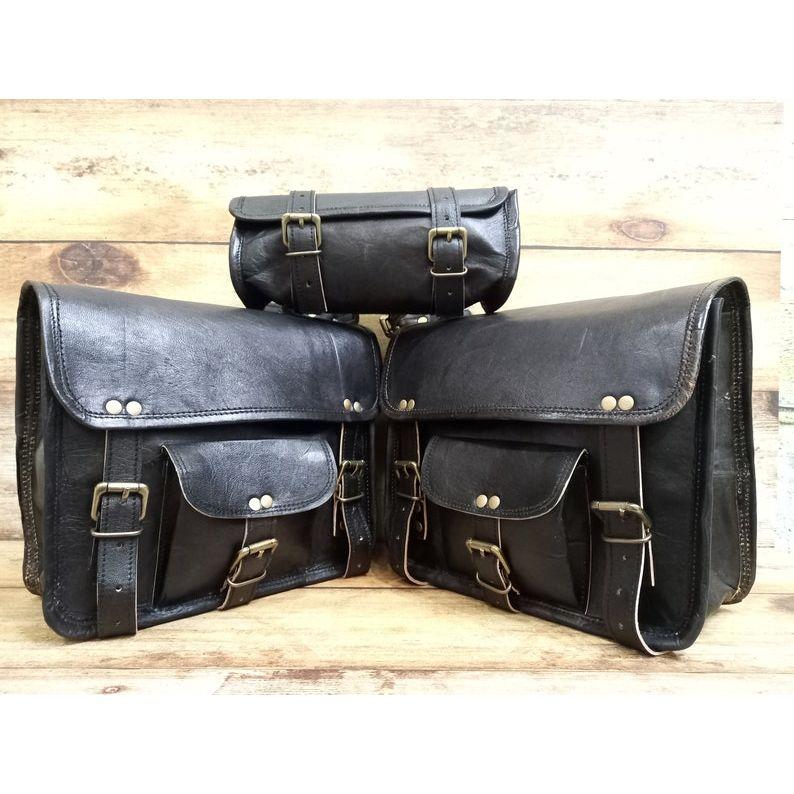 Handmade Black Leather Motorcycle Saddlebag Set: Panniers & Tool Pouch