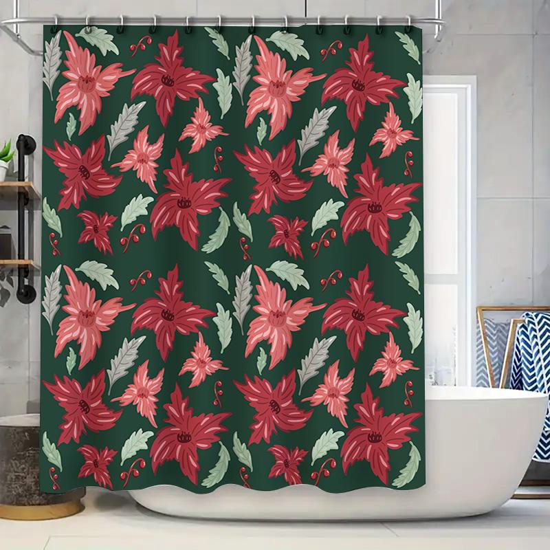 Green Christmas Shower Curtain with Red Poinsettia Floral Pattern, Polyester Fabric, Waterproof Home Decor Item for Bathtub Size