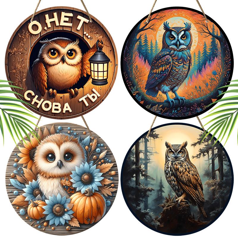 4 Different Styles of Russian Wooden Sign with Owls Pattern, Round Sign for Front Door, Wall Hanging Decor, Ideal Gift for Friend & Family