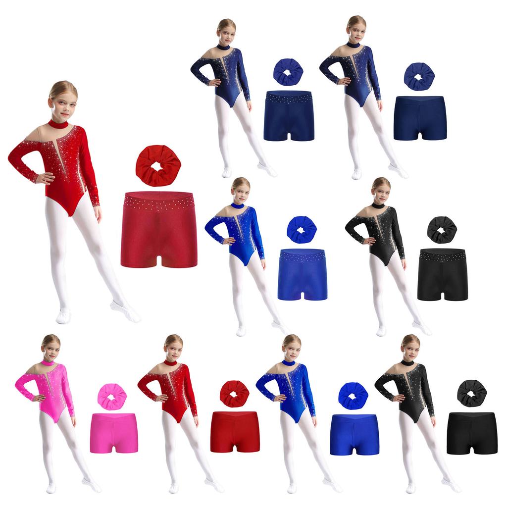 Girls Gymnastics Dance Outfit Set Long Sleeve Keyhole Back Sheer Mesh Patchwork Sparkly Leotard Shorts Hair Band — buy online with free worldwide shipping!