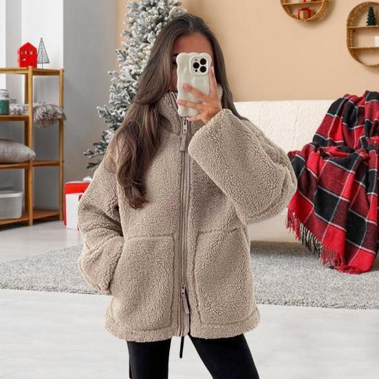 Women's Fleece Jacket Oversized Zip Up Stand Collar Fuzzy Sherpa Coat with Pockets Casual Winter Fall Outerwear — buy online with free worldwide shipping!