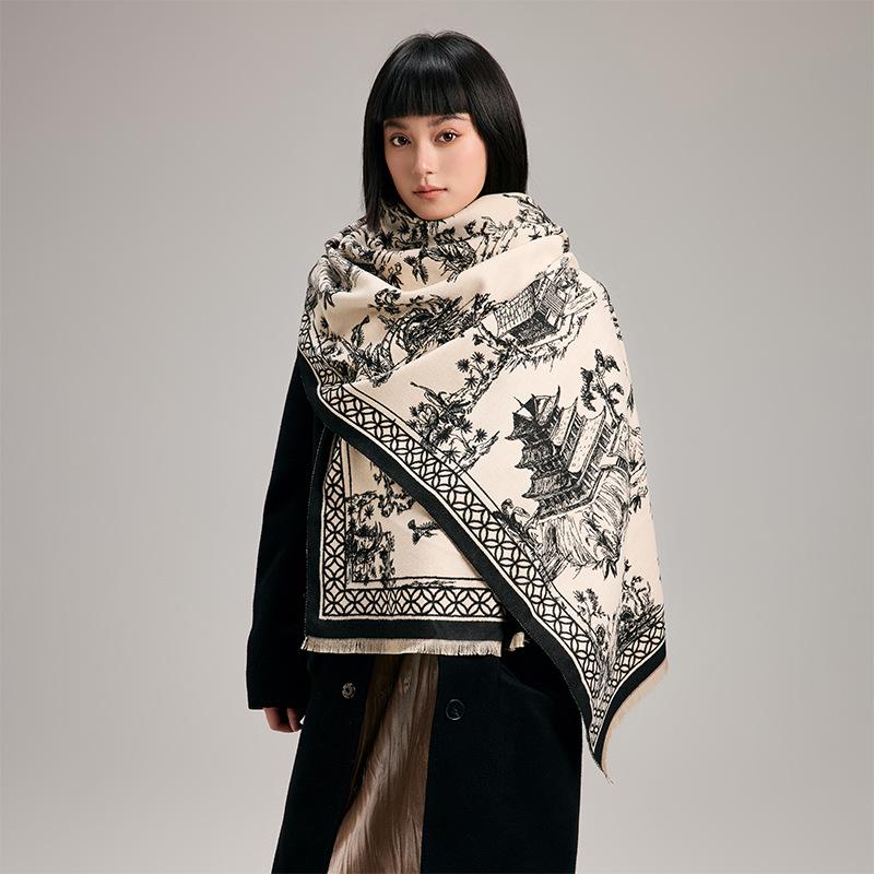Antique Winter Warm Fashion Advanced Sense Age-Reducing Scarf Literary And Retro Double-Sided Shawl Cape Versatile Scarf Women