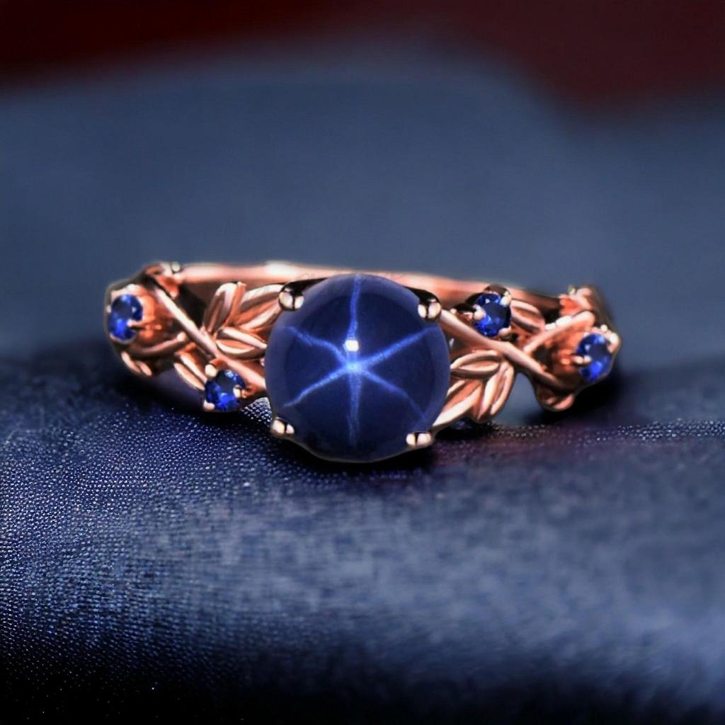 Celebrate nature-inspired elegance with this Handmade Rose Gold Plated Star Sapphire Ring, crafted in 925 Sterling Silver with a warm rose gold finish. Featuring a glowing star sapphire as the centerpiece, the band is designed in a branch and leaf motif, giving it a unique twig-inspired Art Deco look.
