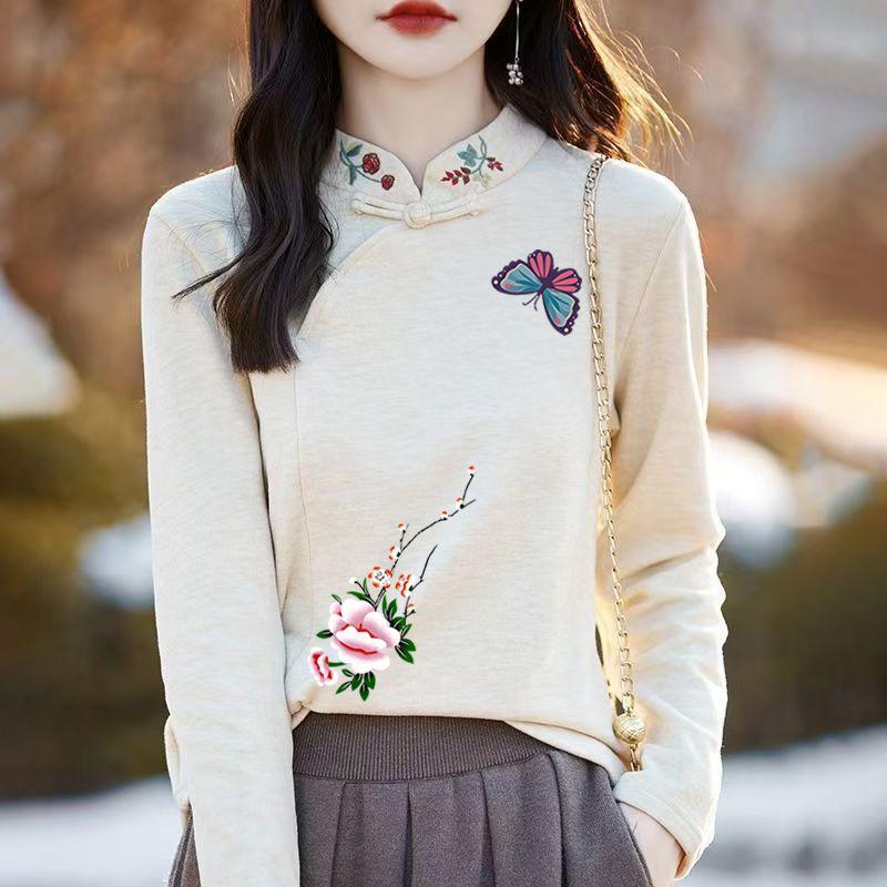 Autumn and Winter Women's Double-sided Fleece Undershirt Embroidered Loose Long Sleeve T-shirt