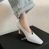 Fashion 2025 White Square Head High Heels Autumn New Temperament Thick With Niche Design V-Mouth Leather Vintage Single Shoes Women