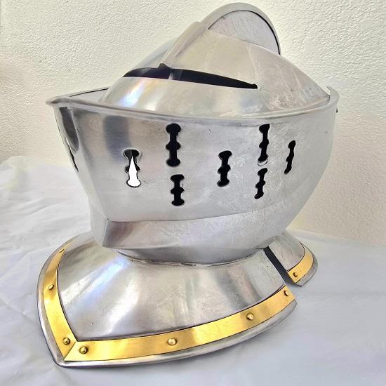 Authentic Medieval Design: Inspired by historical European knight helmets, this piece features a fully functional visor and detailed brass trim accents that replicate the regal look of a knight’s armor.