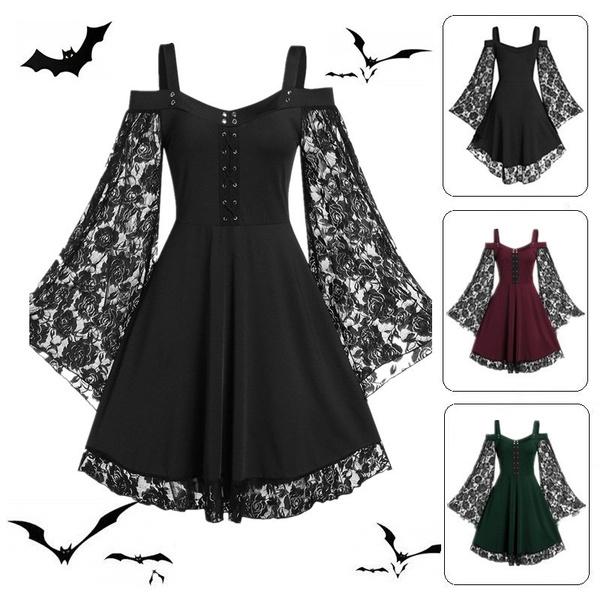 Vintage Gothic Women Dress Lace Crochet Flare Sleeve Vampire Witch Dresses Medieval Renaissance Goth Cosplay