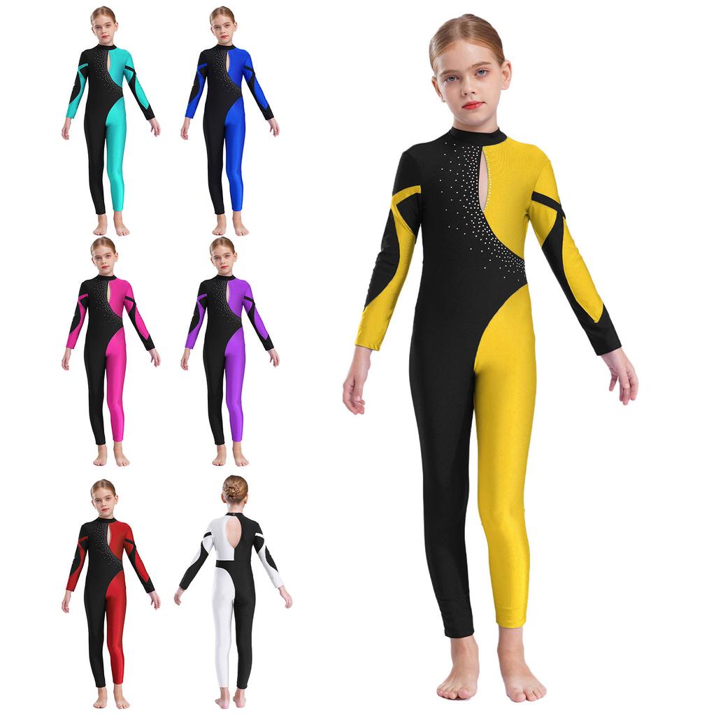 Rhythmic Gymnastics Jumpsuits Kids Shiny Rhinestone Ice Skating Bodysuit Girls Long Sleeve Ballet Dance Full Body Leotards Unitards Stage Wear