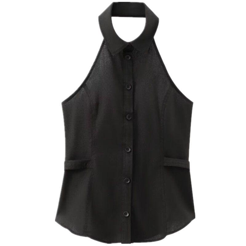 Fashion Style 2024 Summer New Women's Clothing Buckle Decoration Linen Blended Hanging Collar Tops 8001709 — buy products online with free worldwide shipping!