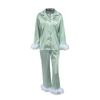 Women Spring Fall Soft Pajamas Sets Fur Feather Trim Long Sleeve Button Satin Silk Shirts Pants Loungewear Sleepwear Homewear