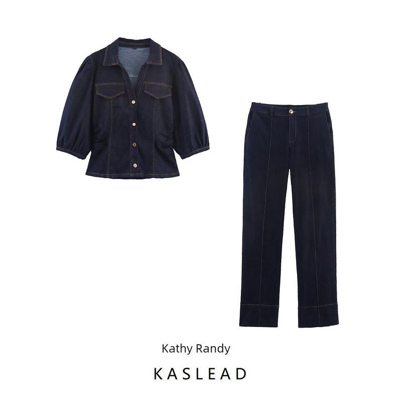 Kaslead New Women Clothes Western Style Slim Fit Puff Sleeve Shirts Trumpet Pants 8279406 8082576