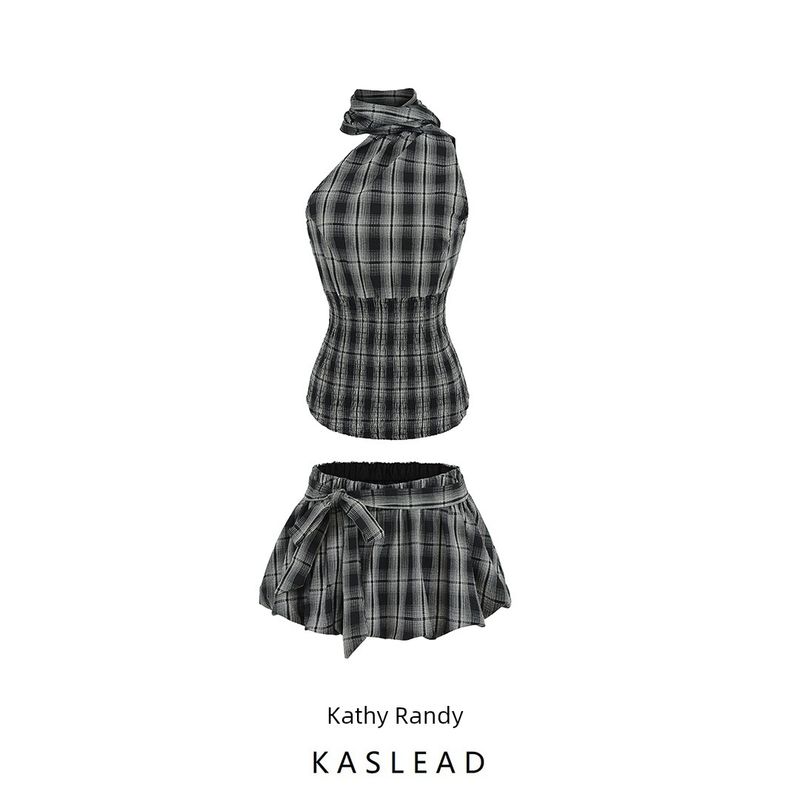Kaslead New Arrival Women's Clothing Fashion Style Fashion Simple Plaid Halter Top Half-Length Skirt Outfit
