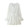 Kaslead New Women Clothes Western Style Simple V-neck Bell Sleeve Waist Hugging Ribbon Dress
