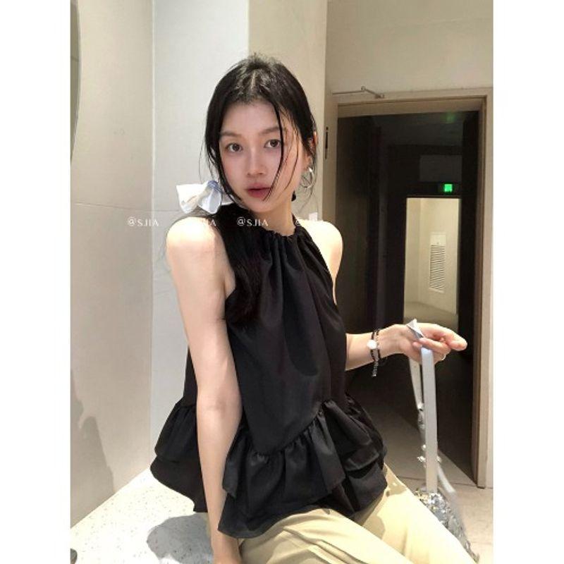 Kumikumi Sweet and Spicy Style Hanging Neck Sleeveless Black Vest Women Clothes Summer Temperament Patchwork Frill All-Match Top