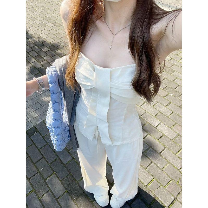Pure Desire Style Suit Niche Style Pleated Tube Top Vest Women's Clothing Summer High Waist White Straight-Leg Pants Casual Pants Two-piece Set — buy products online with free worldwide shipping!