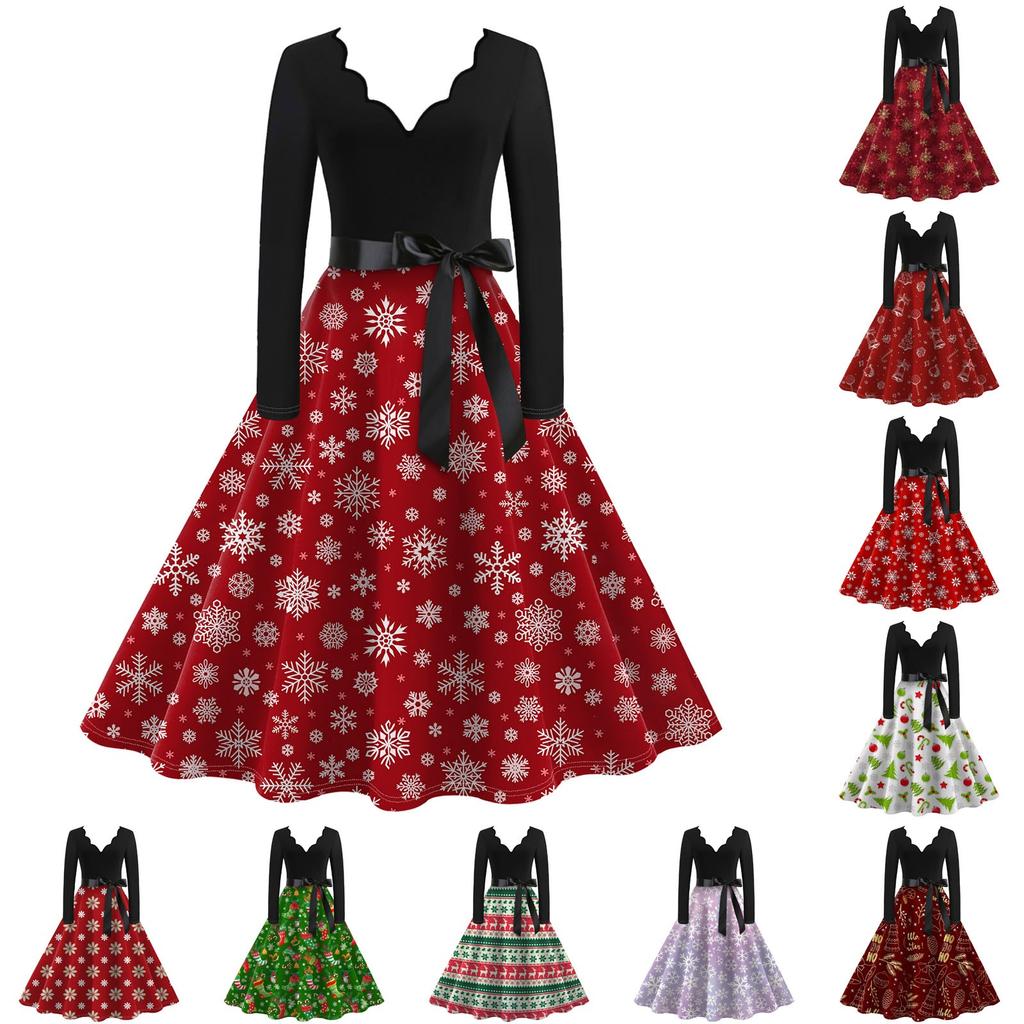 Ladies Casual Fashion V-Neck Long Sleeve Christmas Print Vintage Dress — buy online with free worldwide shipping!