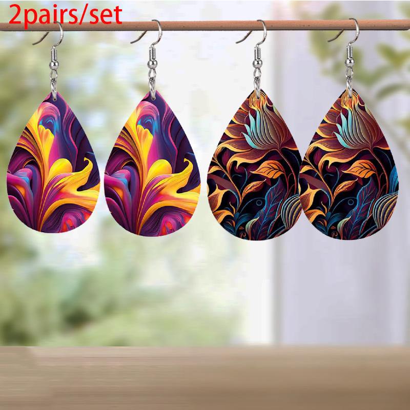 Fashion Color PU Faux Leather Earrings for Women Double-sided Print Abstract Flower Leather Pattern Tears Earrings Elegant Trendy Earrings Jewelry — buy online with free worldwide shipping!